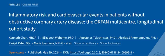 英国CaristoDiagnostics公司在《柳叶刀》上发表了《无阻塞性冠状动脉疾病患者的炎症风险和心血管事件:ORFAN多中心纵向队列研究(TheLancet·PublishedOnline)》,揭示一项具有里程碑意义的临床研究结果。