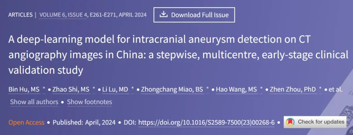 他们也于《TheLancet·DigitalHealth》发表了《中国CT血管造影图像颅内动脉瘤检测的深度学习模型:一项分步、多中心、早期临床验证研究》。