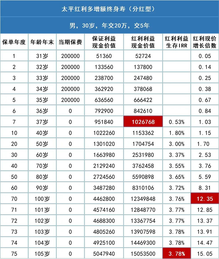 保单利益中后期势头很足,分红演示下客户80岁时IRR高达3.65%;