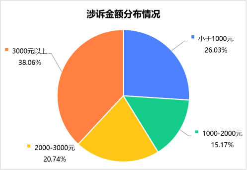 消费保平台的数据显示,洗地机相关投诉中,涉诉金额在3000元以上的投诉占比最高,为38.06%;其次是金额小于1000元的投诉,占比为26.03%。