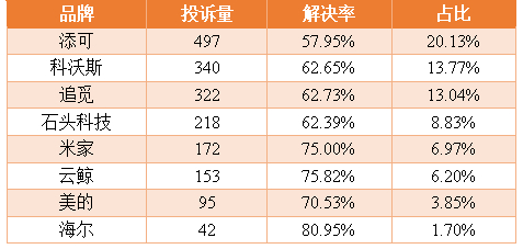 其中,添可的投诉量为497件,占比为20.13%;科沃斯的投诉量为340件,占比为13.77%。海尔、云鲸、米家、美的在投诉解决率方面表现突出,均超过70%。然而,添可、石头科技、科沃斯、追觅的投诉处理效率亟待提升。