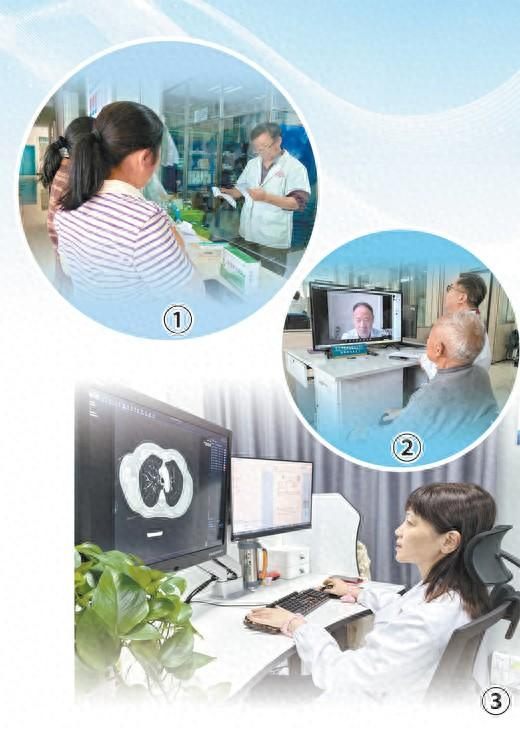 图①:贵州省余庆县龙溪中心卫生院,患者在窗口取药。 本报记者 程 焕摄 图②:江苏省东台市梁垛镇临塔村卫生室,患者进行远程诊疗。 本报记者 申少铁摄 图③:江苏省东台市影像云诊中心,东台市人民医院影像科医生正在诊断患者影像。 本报记者 申少铁摄