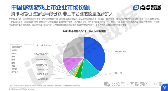 2024年中国移动游戏市场研究报告揭示了市场的多维发展态势。2023年,市场收入达到2567.4亿元,同比增长3.2%,显示出竞争已从内容和运营层面扩展至更新节奏、定价等多维度。超过8亿的玩家基数和游戏版号的稳定发放,为市场注入了信心。腾讯和网易继续以超半数份额领跑,同时非上市企业逐步扩大其市场影响力。