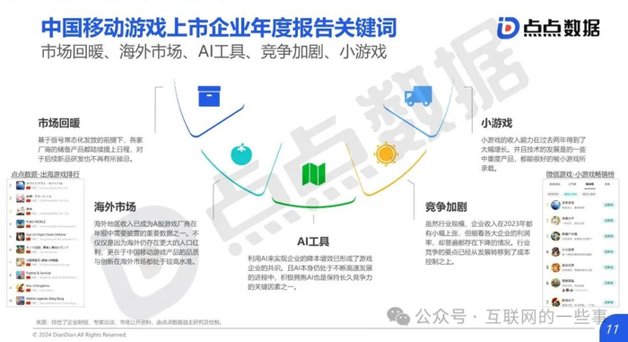 报告强调了小游戏端和云游戏的潜力,预计成为未来游戏行业的重要渠道。高质量精品化成为研发趋势,而中国出海移动游戏在美日市场表现强劲,展现了长尾效应。玩家更倾向于长期稳定的老产品,新手机出货量的增长带动了老游戏的下载量。RPG类游戏在买量上占主导地位,动作游戏在iOS端有明显优势。
