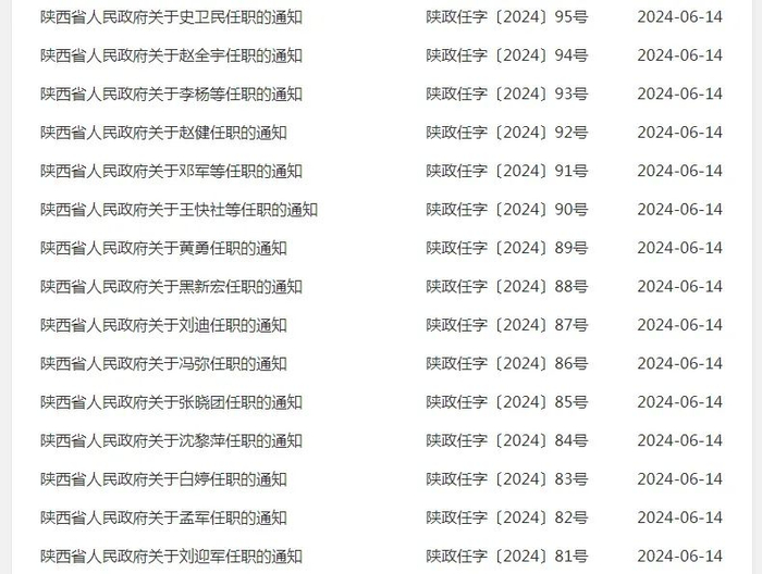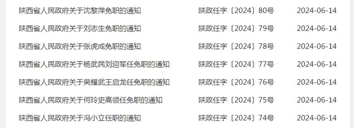 6月14日,陕西省人民政府网站发布一批人事任免通知。