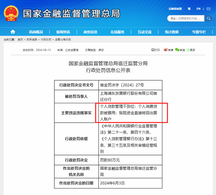 据监管披露,上海浦东发展银行股份有限公司宿迁分行,因为个人贷款管理不到位;个人消费贷款被挪用;贴现资金直接转回出票人账户等事项,国家金融监督管理总局宿迁监管分局罚款80万。