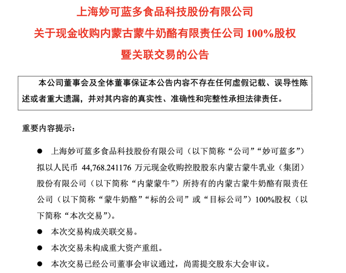 近日,妙可蓝多发布公告,拟以4.48亿元现金收购控股股东内蒙古蒙牛乳业(集团)股份有限公司(下称“内蒙蒙牛”)所持有的内蒙古蒙牛奶酪有限责任公司(下称“蒙牛奶酪”)100%股权。如本次交易成功完成,蒙牛奶酪将成为妙可蓝多全资子公司,纳入公司合并报表范围。