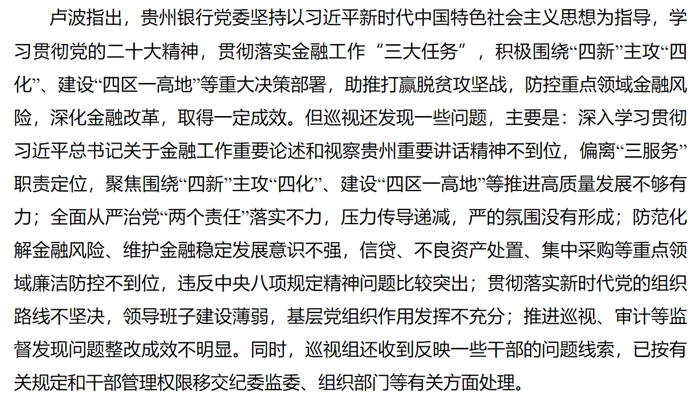 巡视情况称,贵州银行防范化解金融风险、维护金融稳定发展意识不强,信贷、不良资产处置、集中采购等重点领域廉洁防控不到位,违反中央八项规定精神问题比较突出;贯彻落实新时代党的组织路线不坚决,领导班子建设薄弱,基层党组织作用发挥不充分;推进巡视、审计等监督发现问题整改成效不明显。