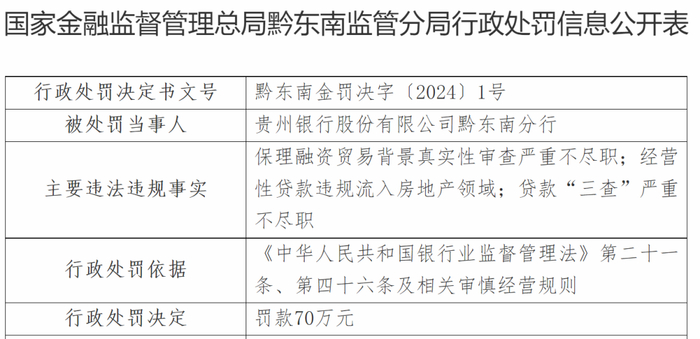 处罚涉及到的还包括,施秉支行、雷山支行、岑巩支行、凯里宁波路支行等的时任行长、副行长等。