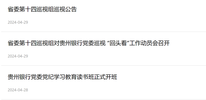 2024年年初,贵州省纪委监委派驻贵州银行纪检监察组发文,2023年以来,派驻贵州银行纪检监察组全力协同配合省纪委监委有关办案部门和地方纪委监委严肃查办严重违纪违法腐败案件8件,其中派驻贵州银行纪检监察组立案审查6人。