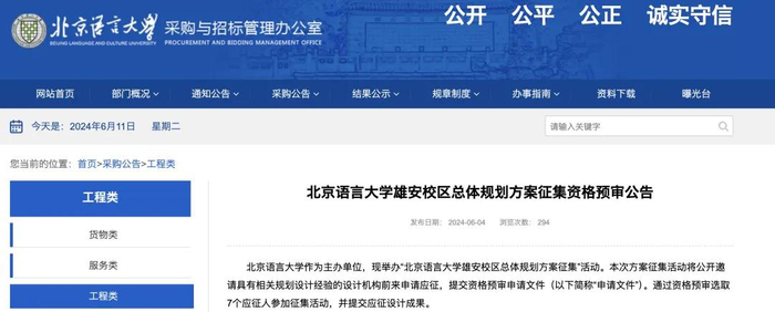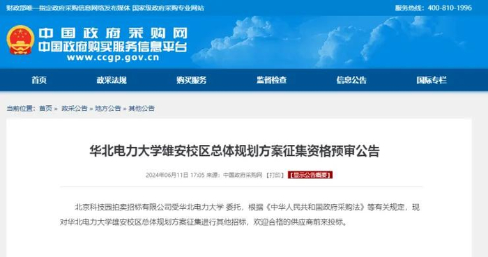 6月11日,中国政府采购网发布《华北电力大学雄安校区总体规划方案征集资格预审公告》