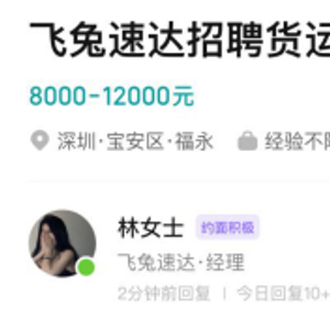 “招聘广告没说需要买车”,刘心开门见山。2024年3月初,他在BOSS直聘平台看到深圳市飞兔速达城配有限公司在“直招送货司机”,薪酬标价8000到1.2万元,并写着“车辆由公司免费提供”。刘心加了招聘人员的微信后,对方不愿多聊,直接约了线下面谈。