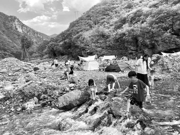 “绝美森系小溪!北京免费露营玩水天花板!”社交平台上,一名京郊亲子游博主在笔记中晒出多张实况照片,画面中山清水秀,孩子站在浅滩中玩着水枪,十分惬意。“开车直达水边,小鱼成群,水清澈到底,停车免费,可露营、烧烤、捞鱼、溯溪。”