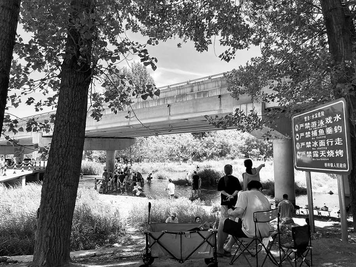 早上不到9点,记者来到博主分享的怀柔区桥梓镇一渡河桥。桥下浅滩处,已经有孩子手持渔网进入河道,大人则把折叠椅放在河道中央的碎石上,悠闲地坐着乘凉。