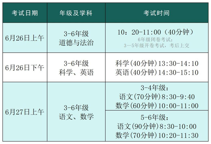 期末考试时间安排:小学、初中期末考试时间为6月26日至28日,幼儿园和中职学校参照执行,7月1日起放暑假。普通高中期末考试时间为6月30日至7月2日,学考时间为7月6日至7日,7月8日起放暑假。
