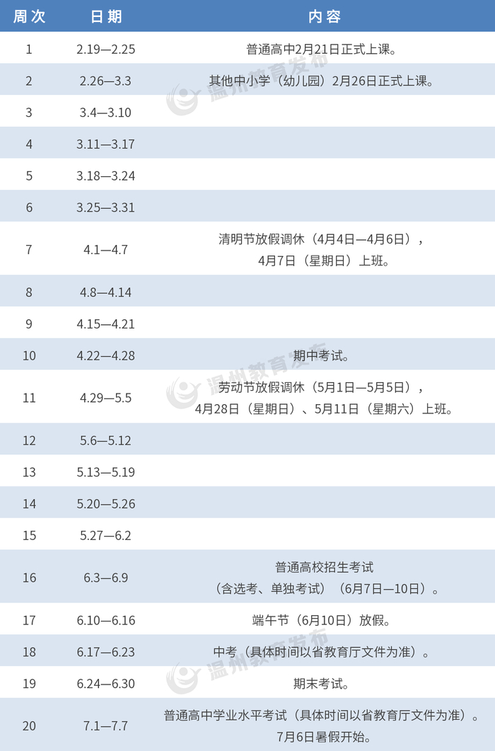 普通高中学校:高一高二期末考试时间为6月26日至28日。暑假原则上从7月8日开始,教师原则上于7月9日离校。