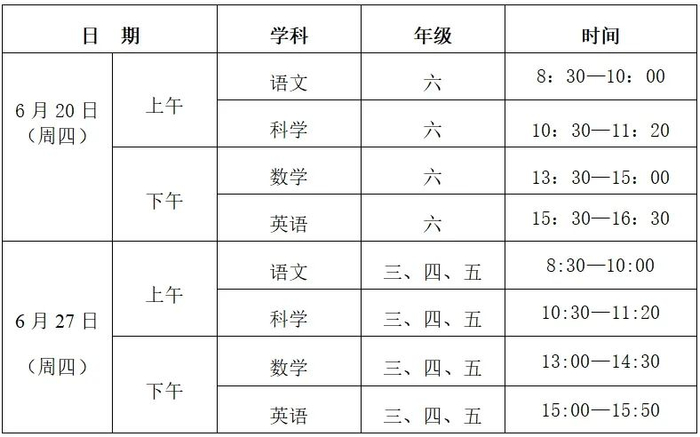 小学一、二年级:实行无纸化测试,由各校自行安排时间组织。