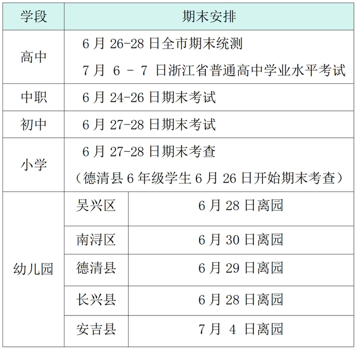 小学、初中6月29日—7月1日,中职学校6月28日—30日期末考试,部分年级质量监测时间由教育学院安排,7月4日学期结束,7月5日暑假开始,幼儿园参照执行。