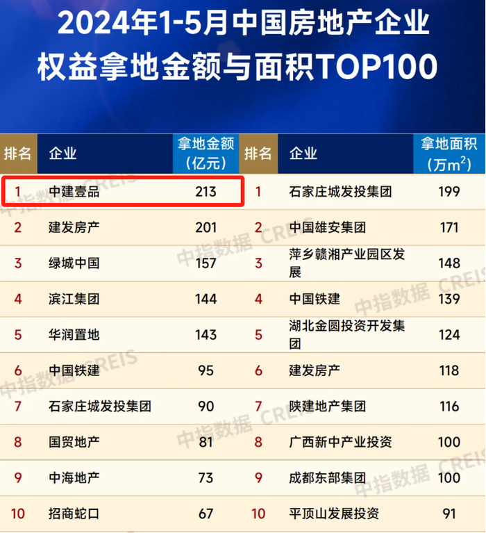今年1-5月,中建壹品以213亿权益拿地金额,力压保利发展、中海、华润、招商蛇口、建发等一众头部房企,成为土拍市场“最猛”的选手。