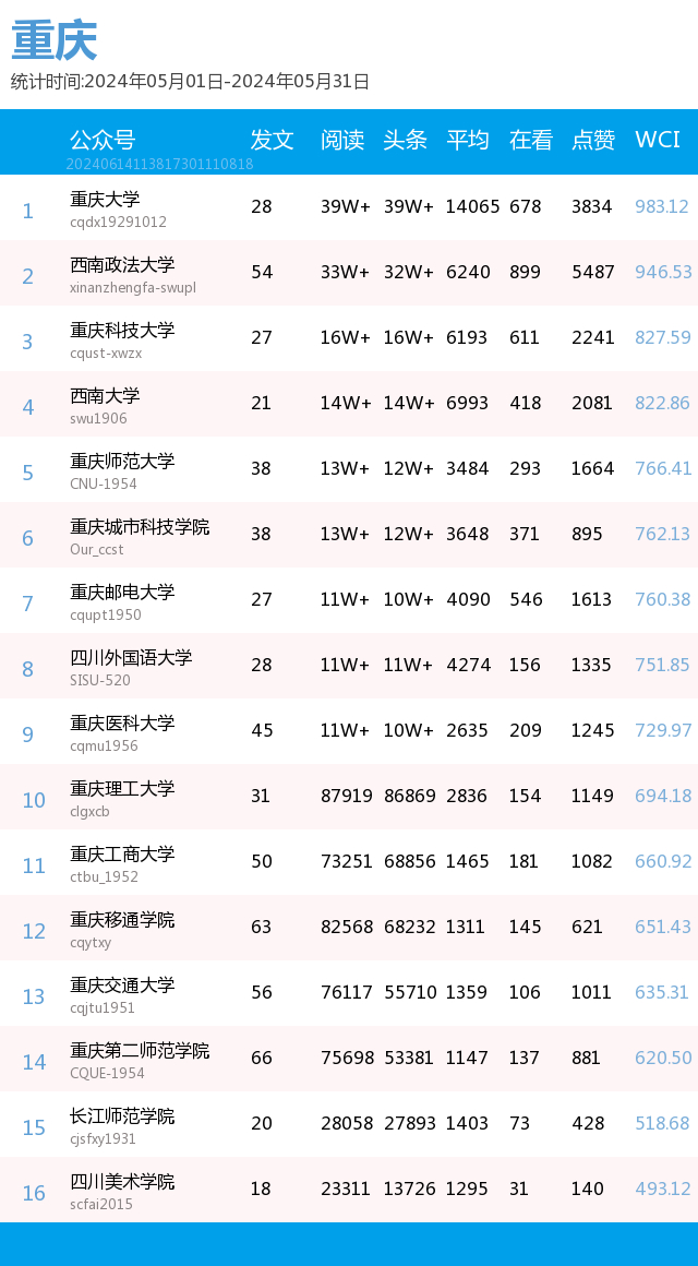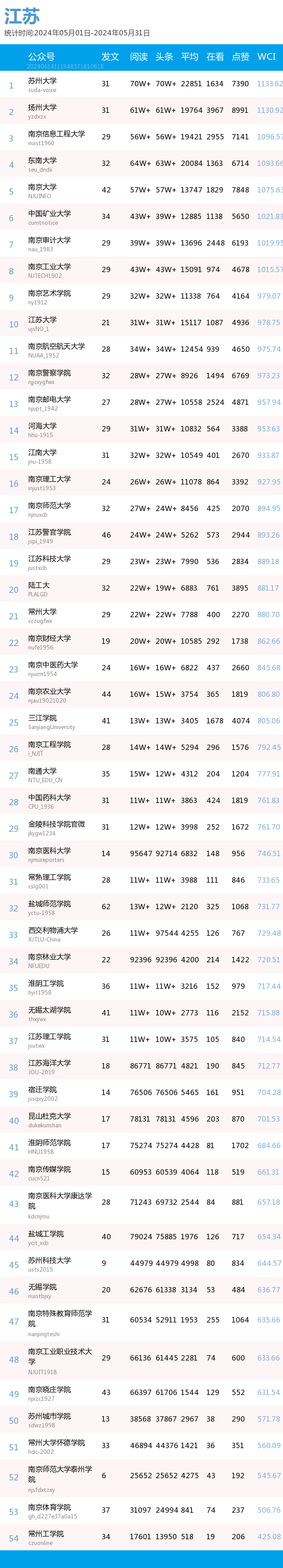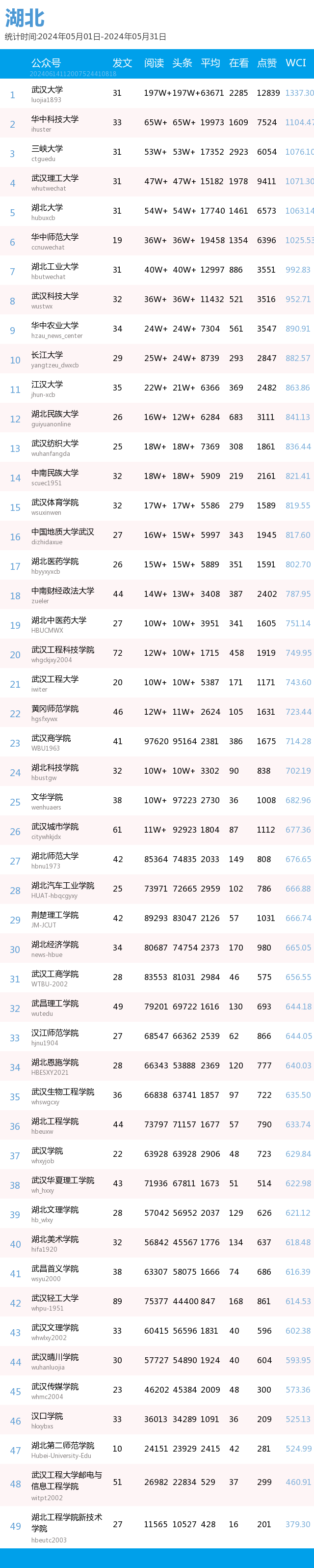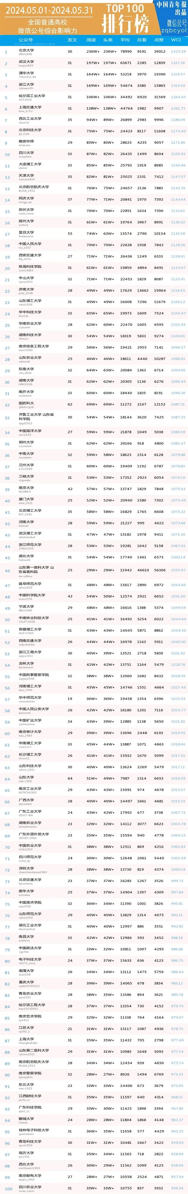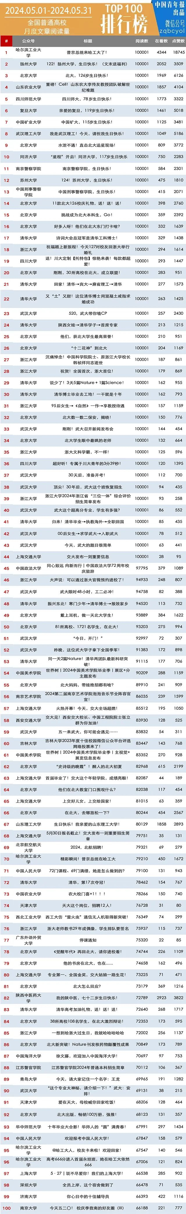 月榜 | 中国大学官微百强(2024年5月普通高校公号)