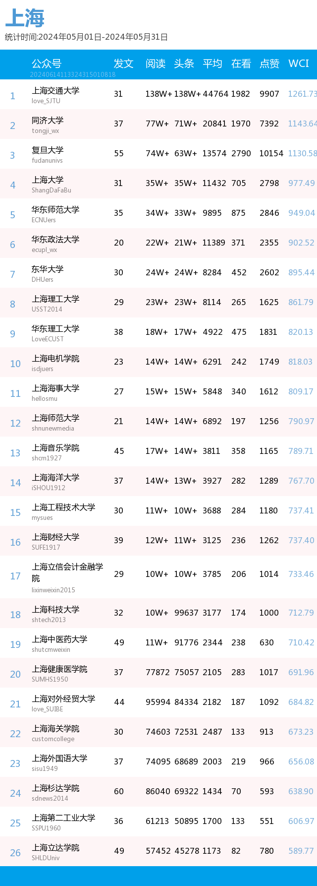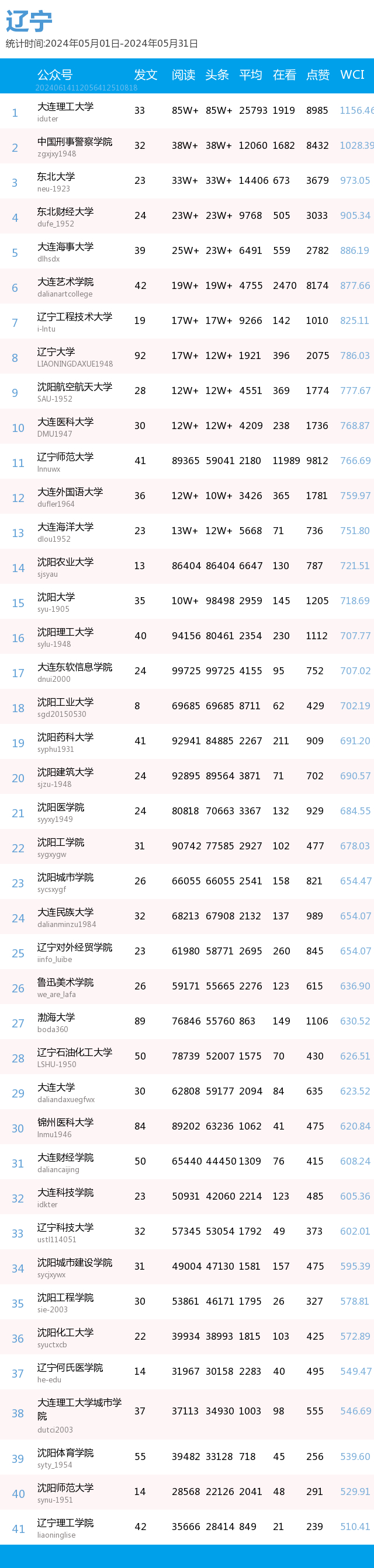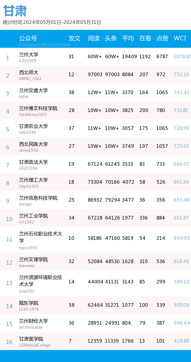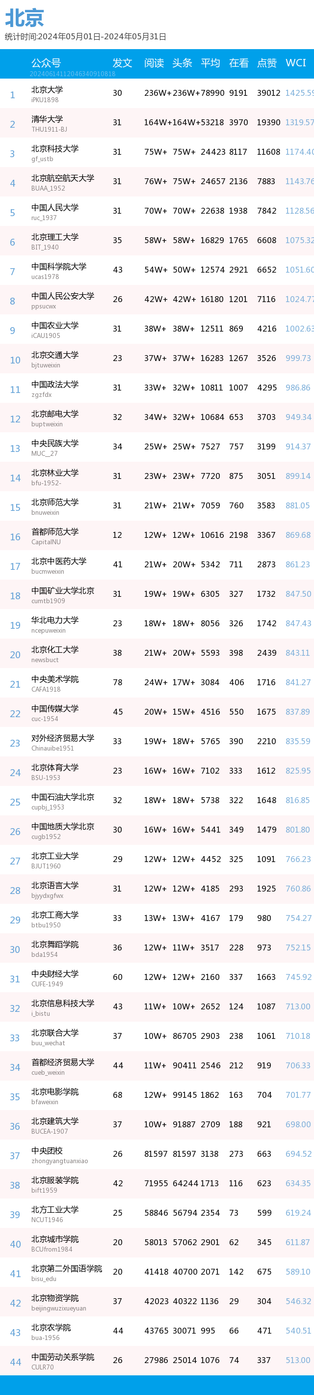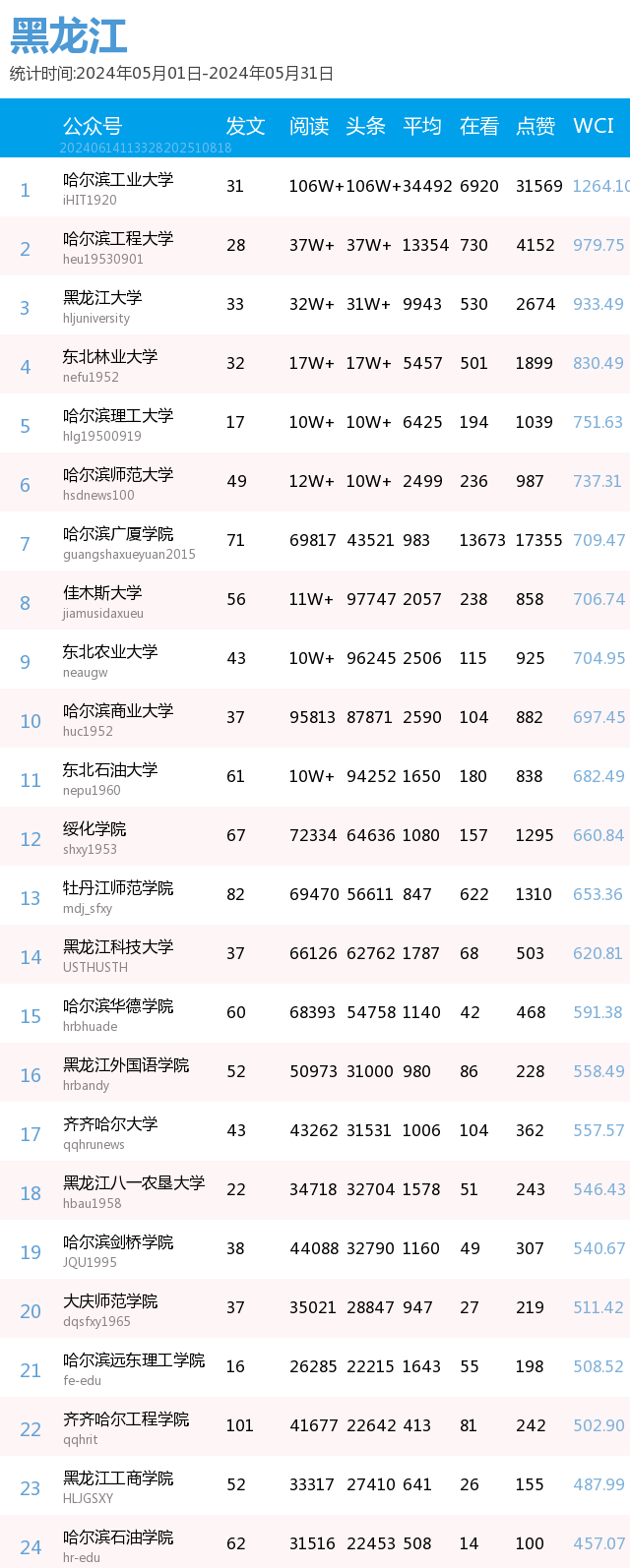 月榜 | 中国大学官微百强(2024年5月普通高校公号)