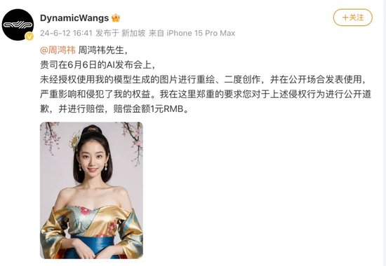 6月12日,DynamicWangs继续在微博@周鸿祎,称“未经授权使用我的模型生成的图片进行重绘、二度创作,并在公开场合发表使用,严重影响和侵犯了我的权益。我在这里郑重的要求您对于上述侵权行为进行公开道歉,并进行赔偿,赔偿金额1元RMB。”