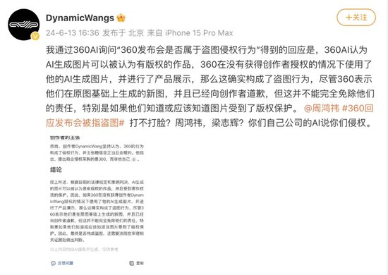 360方面暂未对DynamicWangs的说法进行回复,6月13日,该创作者还发微博,称其通过360AI询问“360发布会是否属于盗图侵权行为”得到的回应是,这确实构成了盗图行为。他又喊话360方面:“打不打脸?周鸿祎,梁志辉?你们自己公司的AI说你们侵权。”
