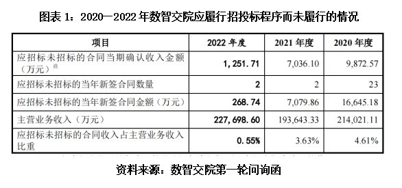 第一轮问询函回复文件显示,2020—2022年,数智交院存在应招标而未招标的合同,各期确认收入金额分别为9872.57万元、7036.1万元、1251.71万元,合计为1.82亿元。同期,其应招标而未招标的合同收入占主营业务收入的比重分别为4.61%、3.63%、0.55%。