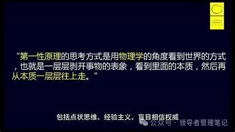马斯克提倡的第一性原理(First Principles)强调从最基本的原理出发,逐步推理,得出结论。古希腊哲学家亚里士多德,主张透过现象看本质。这种思维方式有助于我们更深入地理解问题的本质,并找到更有效的解决方案。