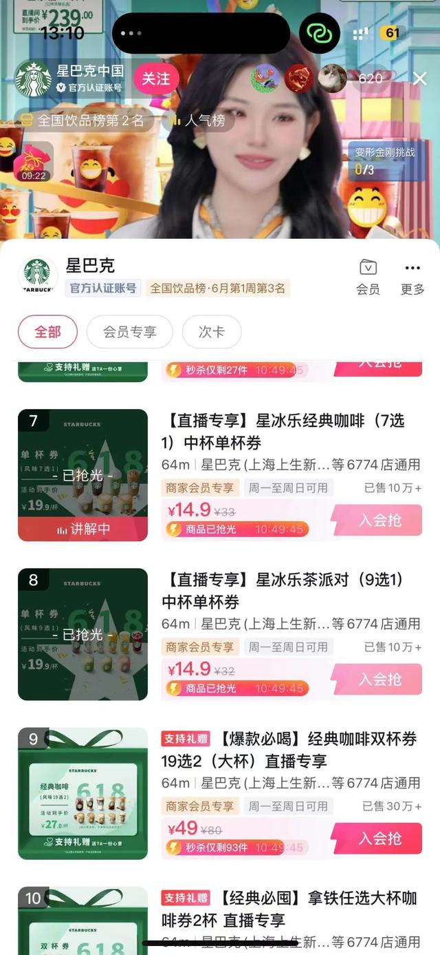 第一财经记者注意到,星巴克小程序内时不时会出现不少“好礼券”,譬如订单满50元立减6元,三杯49.9、双杯39.9、单杯7折券等。此外,星巴克抖音直播间也推出了69.7元三杯、34.9元双杯、14.9元指定饮品的券。也就是说,在星巴克官方渠道上,使用优惠券也能买到15-25元一杯的产品。