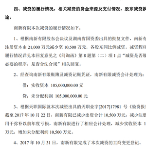 3、根据天职国际就本次减资出具的天职业字[2017]17981号《验资报告》,截至2017年10月22日,南新有限已减少出资合计10,500万元,减少注册资本用于弥补以前年度亏损,南新有限进行了相应会计处理,减少实收资本10,500万元,增加未分配利润10,500万元。