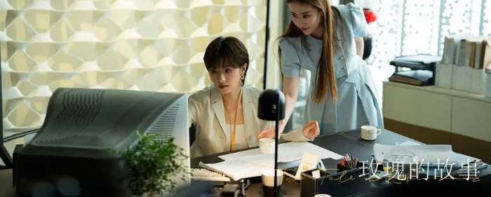 除了“直白”的剧情,各种氛围感镜头也不在少数。比如出场时的回眸一笑,青春靓丽;被指责破坏别人感情,她昂首挺胸出现在办公室,自带光环;即使是和庄国栋吵架“发疯”,各种镜头下的破碎美感、在墙上作画时的艺术美感,时刻在攻击着观众的眼球。甚至于倚在车窗上喝饮料的玫瑰,都宛若在拍画报。