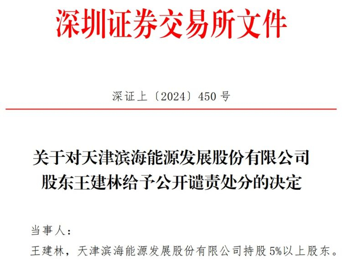 深交所官网6月15日信息显示,因违规买卖股票且未及时披露,滨海能源(000695)股东王建林被深交所公开谴责。