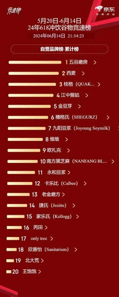 截至6月14日晚间的累计消费数据显示,五谷磨房、江中猴菇这些更适合国人胃的产品备受青睐。