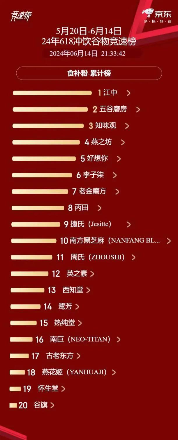 食补粉品类中,江中反超五谷磨房、知味观、燕之坊、好想你等品牌,位列食补粉品类榜首。用一句话来形容食补粉的在榜品牌,中国品牌更懂中国人,更懂养国人的胃。