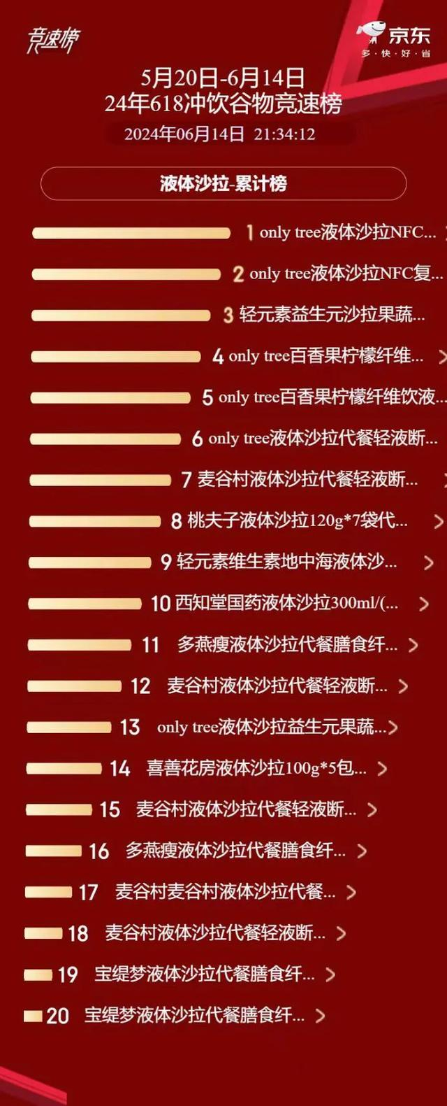 随着消费者对自身健康、身材管理的关注,促进肠道蠕动、更适合轻断食的液体沙拉热销。液体沙拉品类中,前十名的产品only tree品牌占据一半。目前来看,onlytree已经是液体沙拉品类的标杆品牌了。