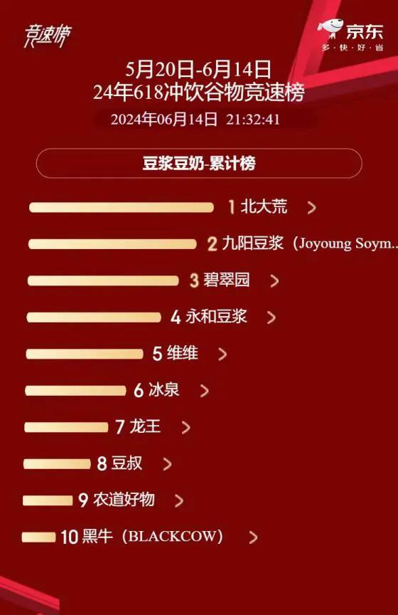 豆浆豆奶作为可休闲饮用、早餐配角的重要品类,不少消费者选择618期间大量囤货。值得关注的是,来自大豆产地东北的北大荒,已经反超九阳豆浆、永和豆浆等老牌,成为累计销售榜单冠军。
