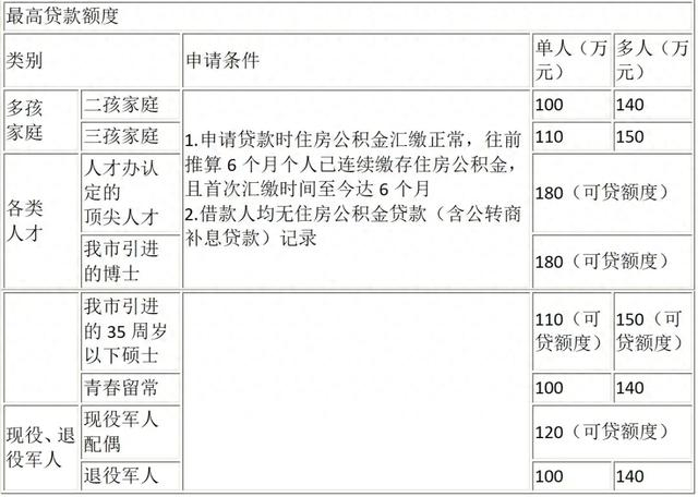 对多孩家庭、各类人才、及现役、退役军人等群体加强住房公积金贷款额度支持。具体内容可参照下表(注:可贷额度为满足下表申请条件后即可享受的最高贷款额度,不受月均余额限制)。