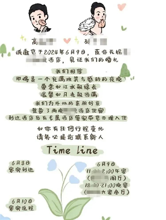 群聊记录中,有网友称无锡锡山区东港镇港下一独生女在谈恋爱时,被男方伪造身份骗取钱财1.3亿元。聊天记录中,还有新人孟某某和孙某某邀约客人于6月9日参加婚宴的邀请函,婚宴举办地点为无锡一高档酒店。