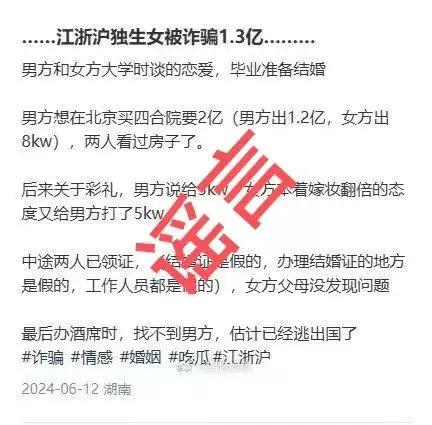 “江浙沪独生女婚恋被诈1.3亿”?警方通报→