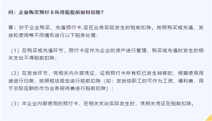 应在业务实际发生时按照规定取得业务实际发生凭据进行扣除,在购买或充值环节,只能取得税率栏为“不征税”的增值税普通发票,预付卡应作为企业的资产进行管理,充值时发生的相关支出不得税前扣除。