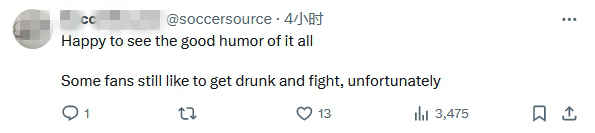“很高兴看到这些幽默,不幸的是,有些球迷仍喜欢喝醉酒打架。”