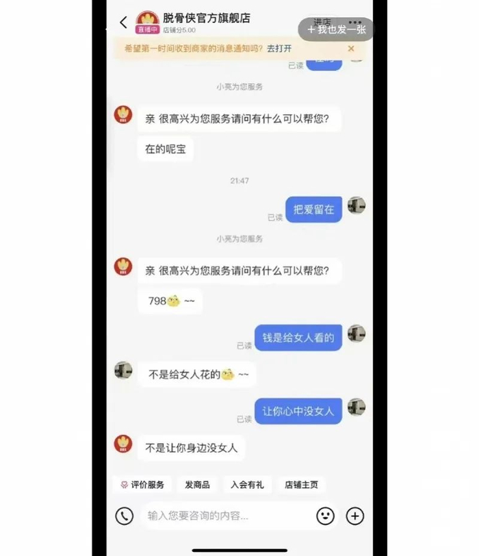 此外,网友也投诉称,脱骨侠食品旗舰店客服在推广该主播带货的无骨鸡爪,也使用“钱是给女人看的,不是给女人花的”作为优惠暗号。