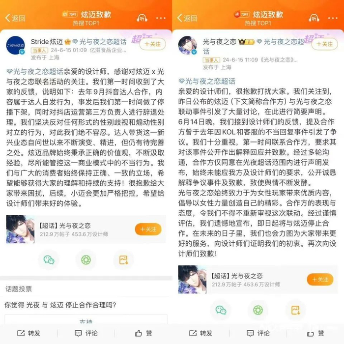 6月15日午时,《光与夜之恋》官方也发声称,6月14日晚,品牌方接到设计师们的反馈,提及合作方曾于去年因KOL和客服的不当回复事件引发了争议。《光与夜之恋》官方称,第一时间联系合作方,要求其对该事件公开作出解释回应并致歉。“经过多轮沟通,合作方仅同意在光夜超话范围内进行声明发布,始终未能应我方及设计师们的要求,公开诚恳解释争议事件及致歉,致使舆情不断发酵。”《光与夜之恋》表示,经过谨慎评估,其遗憾地宣布,即日起将与炫迈停止合作。