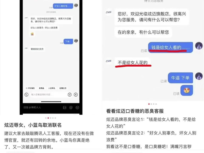 在社交平台上,有网友投诉称,去年炫迈和某电商平台某主播合作推广,使用的“客服优惠暗号”内容表达不当。据网友发布的图片,该电商平台炫迈官方旗舰店的客服表示“好女人别辜负,坏女人别浪费”“钱是给女人看的,不是给女人花的”。