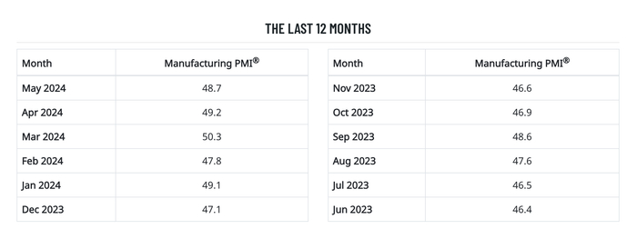 过去12个月美国制造业PMI——ISM数据
