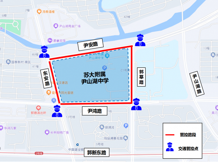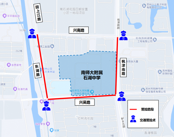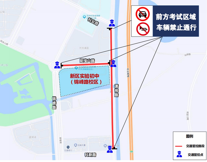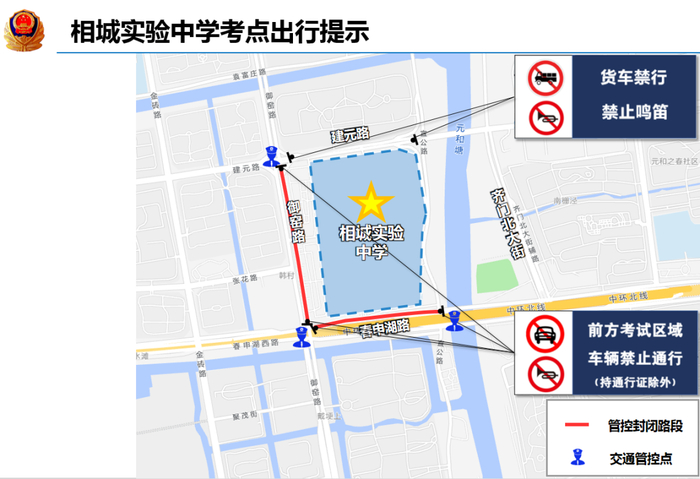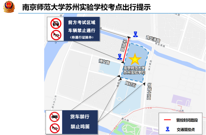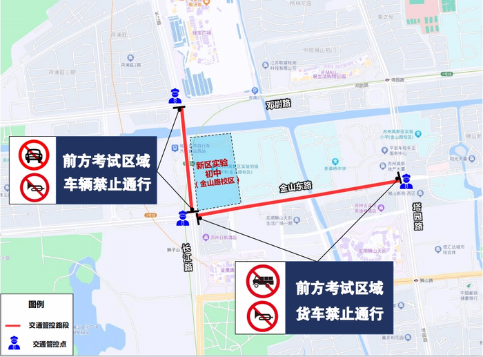 考生进出校门为金山路校门。分别在金山路-塔园路口、长江路-金山路口、长江路邓尉路口负责交通管控,管控期间长江路(金山路至邓尉路段)禁止机动车通行、禁止机动车停放,金山路(长江路至塔园路段)禁止货车、工程车通行,其他车辆禁止鸣号,金山路学校门口禁止机动车停放,家长车辆统一停放至周边停车场内。
