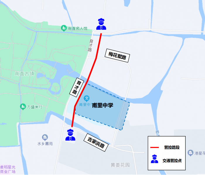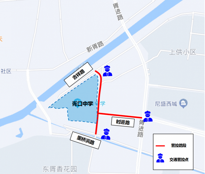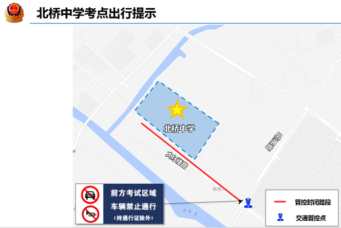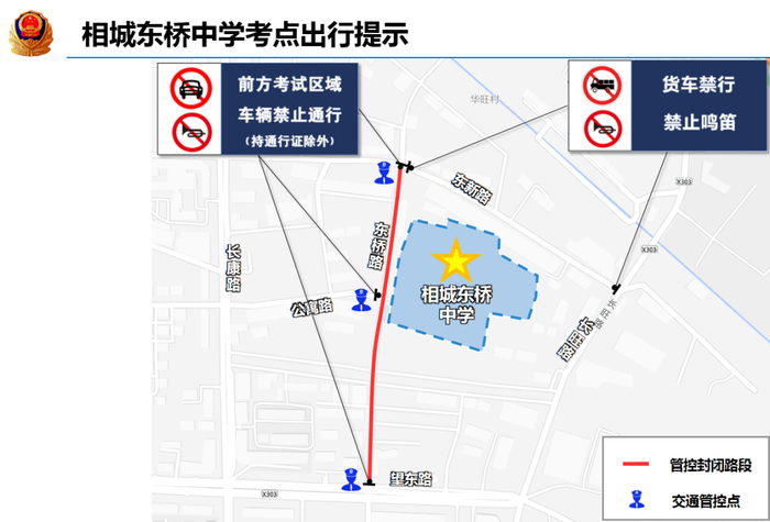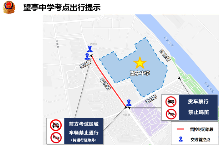 考试期间对华金路-真武路口、华金路-东唐路口、中学门口、华金路-中唐路口真北路-中唐路口、真山路-312国道路口实施交通管控。管控期间华金路真武路路口东向北、南向北货车禁行;华金路东唐路路口、华金路中唐路口南向北、西向北、西向东、南向东货车禁行;真北路中唐路路口西向东、南向东、北向东货车禁行;G312真山路路口东向西、北向西货车禁行。