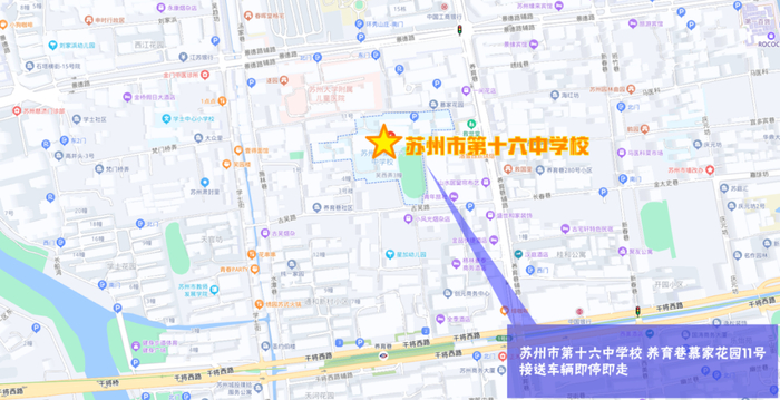 位于姑苏区慕家花园11号,因道路原因不设立交通管制区域及临时停车区域,接送车辆即停即走。