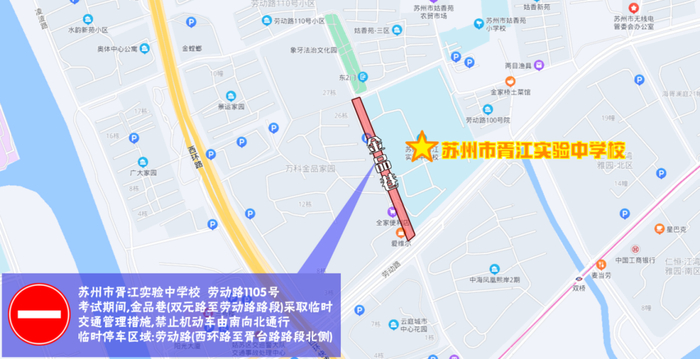 位于姑苏区劳动路1105号,考试期间金品巷(劳动路至双元路)实行交通管控,禁止机动车由南向北通行;临时停车区域为劳动路(西环路至胥台路北侧)。
